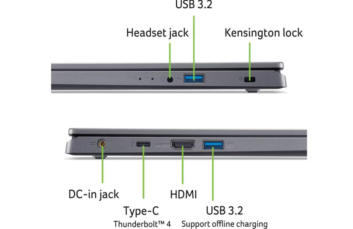 Beim Speicherplatz profitieren Sie von einer schnellen M.2 NVMe SSD Festplattemit grosser 512 GBKapazität. Der Akku hält je nach Anwendung bis zu 7 Stunden. Der Acer Aspire 15 besitzt ein edles graues Gehäuse, welches sehr robust ist.